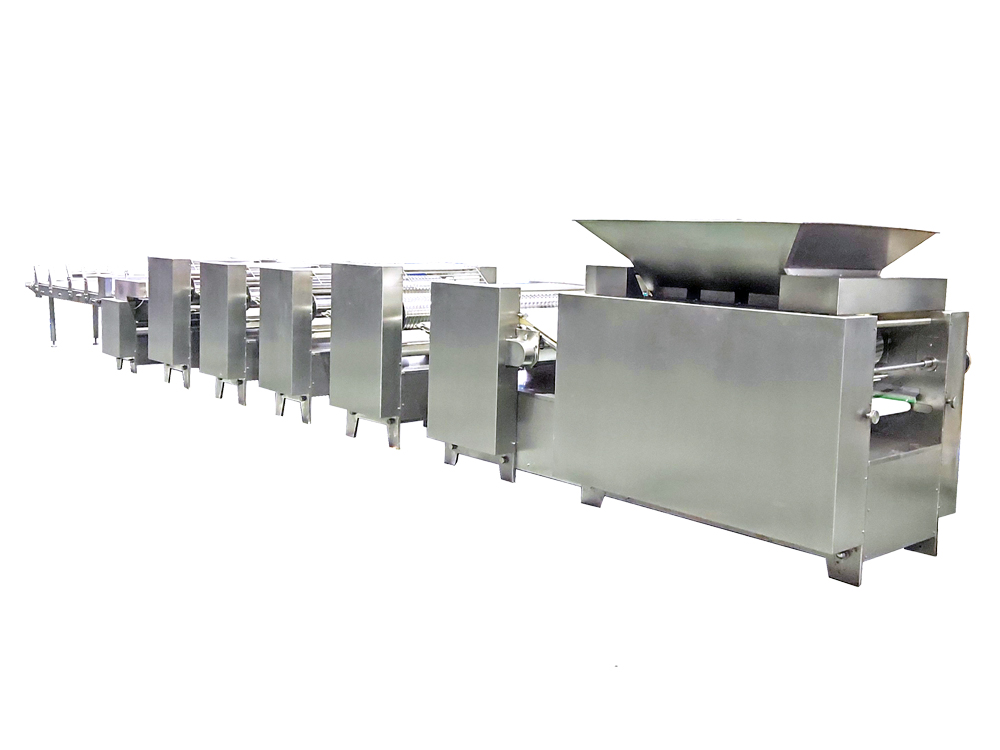 →復(fù)合、壓延、疊層、分切卷皮機(jī)系列  →型號(hào)215/230/280/330/360/540/560型。225型殘皮還原機(jī)  →功能  該系列為配套國內(nèi)外品牌的餃子機(jī)、餛飩機(jī)使用的面帶軋制設(shè)備?!  厣 ?、復(fù)合機(jī)搭配搗面裝置,可使真空和面機(jī)和制出的團(tuán)狀、絮狀面團(tuán),自動(dòng)連續(xù)的進(jìn)入軋制過程?! ?、疊層機(jī)使面帶Z字型折疊,進(jìn)一步豐富面帶網(wǎng)狀結(jié)構(gòu),提高面筋度,設(shè)備可根據(jù)客戶場(chǎng)地需求選擇不同的擺放形式?! ?、多組壓延機(jī)為變頻控制,每一道壓輥都采用單機(jī)驅(qū)動(dòng),通過測(cè)距傳感器,實(shí)現(xiàn)自動(dòng)面帶張緊控制,多輥聯(lián)動(dòng)。進(jìn)一步簡化操作,保證壓延比,滿足多種工藝要求,加工出質(zhì)量穩(wěn)定的面帶?! ?、可根據(jù)不同餃子機(jī)要求軋制不同 規(guī)格厚度及寬度的面帶,面帶經(jīng)過分切后自動(dòng)打卷,操作簡單,安全可靠?! ?、以上設(shè)備均采用不銹鋼軋輥,及符合國家衛(wèi)生標(biāo)準(zhǔn)材料。  6、具體壓輥對(duì)數(shù)可根據(jù)客戶實(shí)際需求定制。  →主要技術(shù)參數(shù)產(chǎn)品型號(hào)總功率(kW)高線速度(m/min)壓面厚度(mm)電壓(V)外形尺寸長×寬×高(mm)215型8.1515457263807104*764*1356230型8.1515457263807104*764*1356280型8.1515457263807104*764*1356330型8.9515457263807104* 884*1356360型8.9515457263807104* 884*1356400型8.9515457263807104* 884*1356540型13154572638010386*1400*1400560型13154572638010386*1400*1400225型殘皮還原機(jī)1.58.26380950*1130*1500